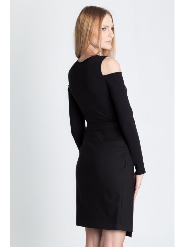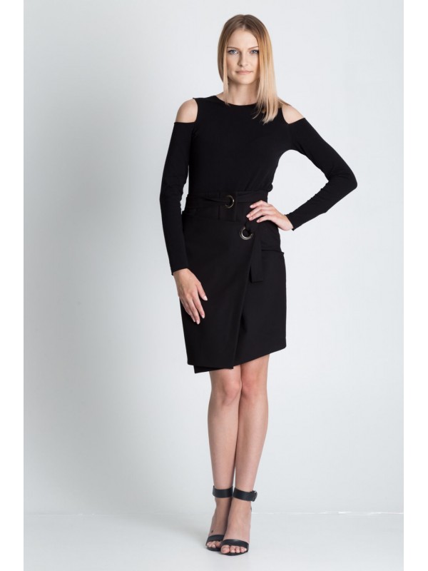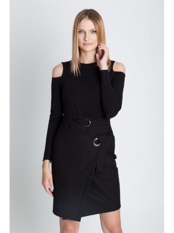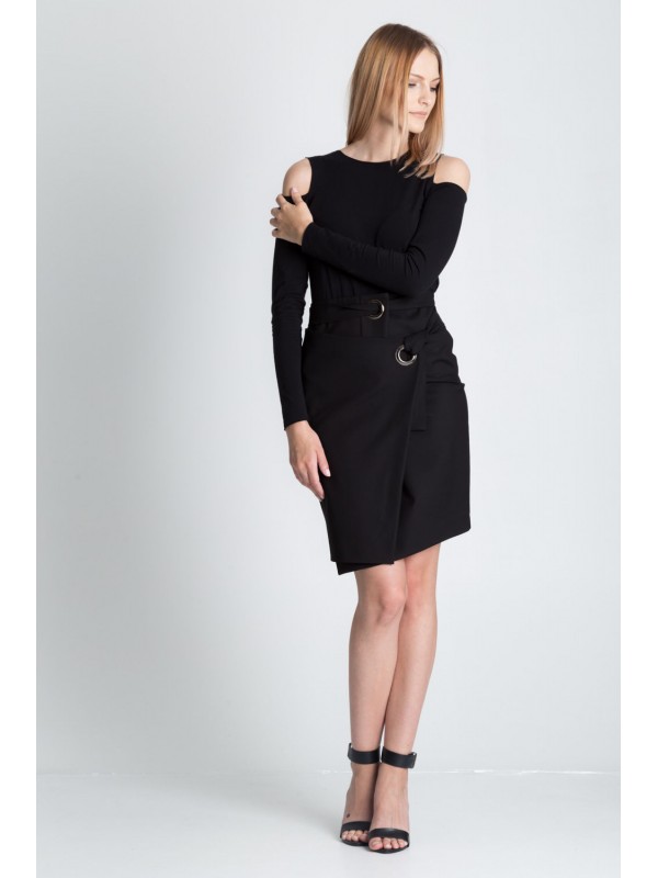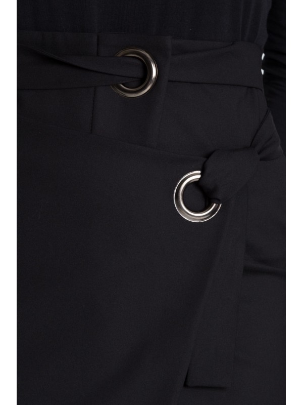 Фантазийная черная асимметричная юбка с запахом. Пояс продевается через люверсы.