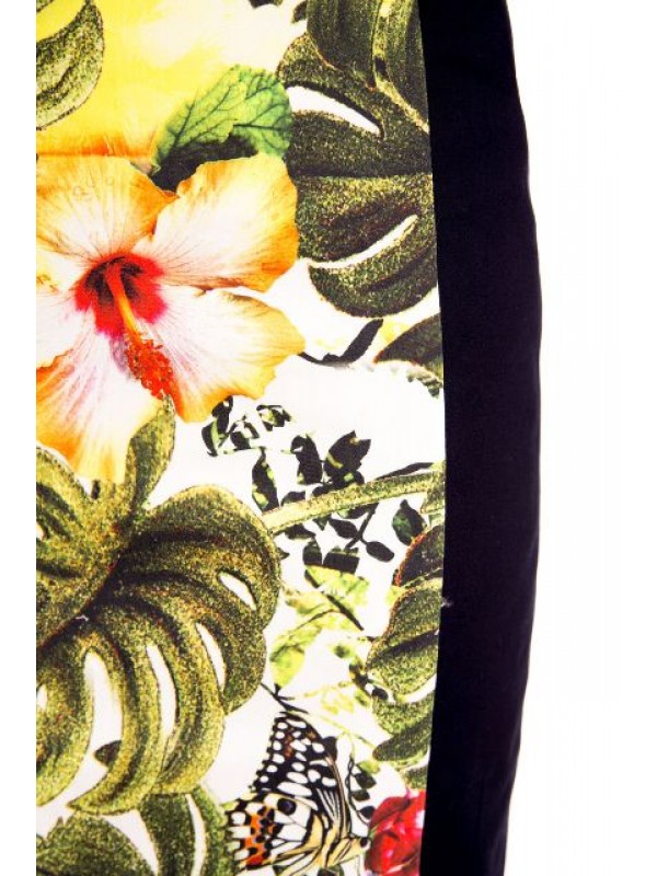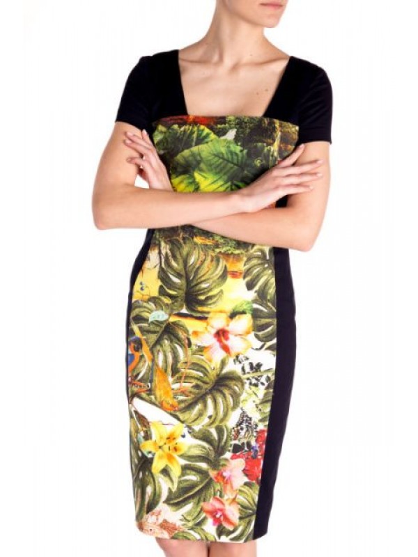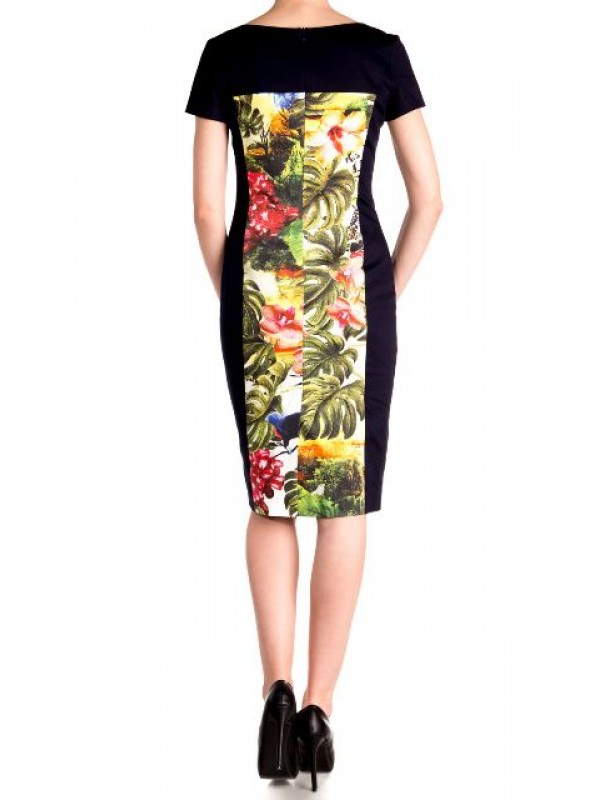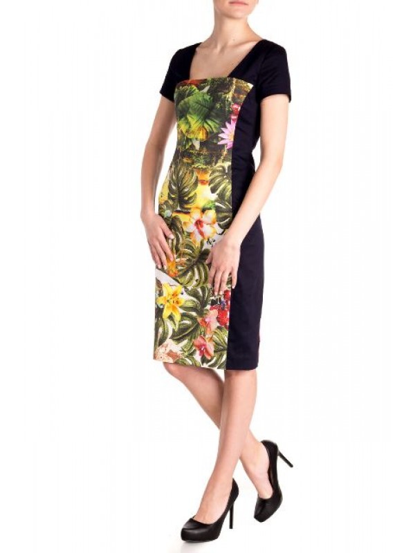 Синее платье с коротким рукавом, принт джунгли. Платье чудесно подчеркивает грудь, бедра и линию ног. Эффектное декольте без вульгарности. Жизнерадостный принт чудесно поднимает настроение. Синие вставки по бокам стройнят фигуру и визуально уменьшают размер. Идеально подходит для тех, кто ищет элегатности в необычном цветовом решении.