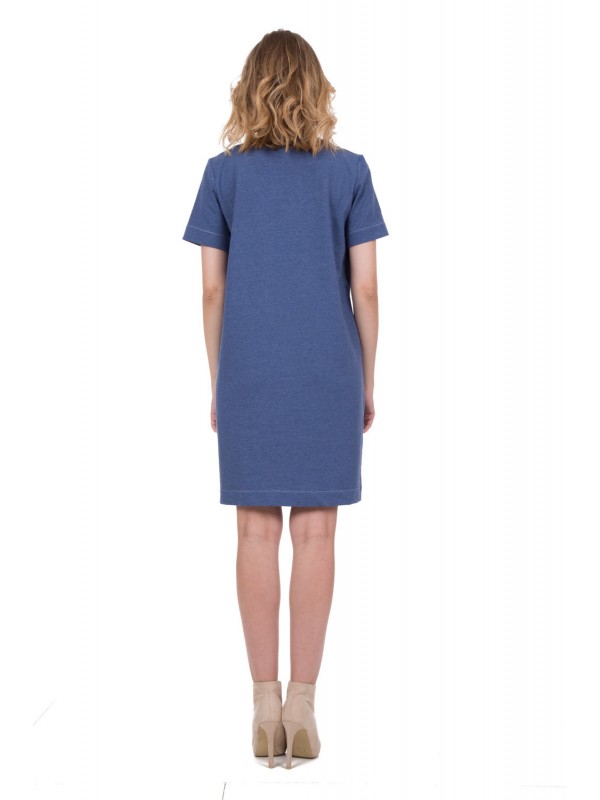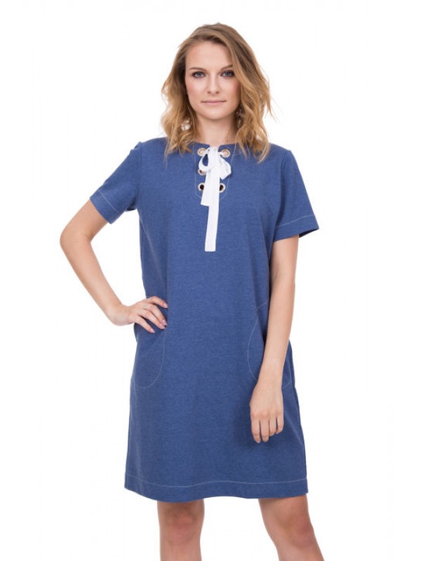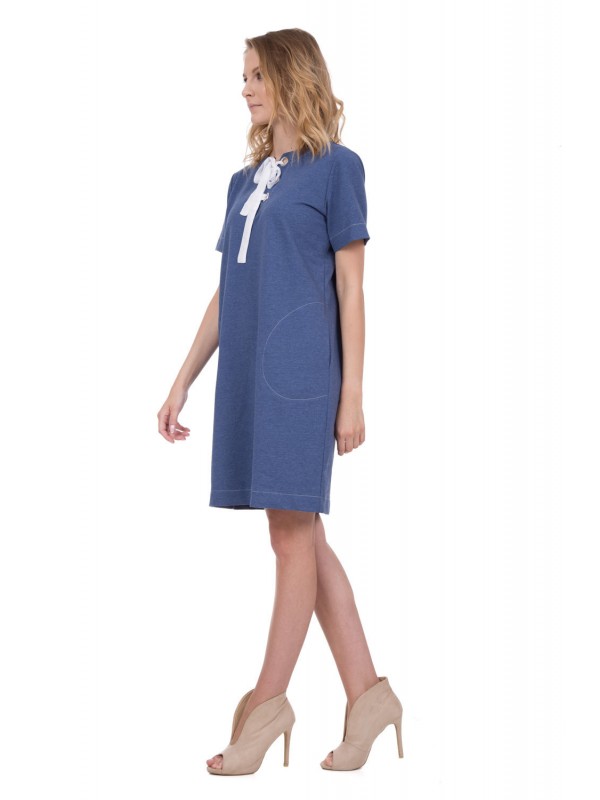 Платье из хлопка прямого кроя с модным декоративным элементом в районе декольте.