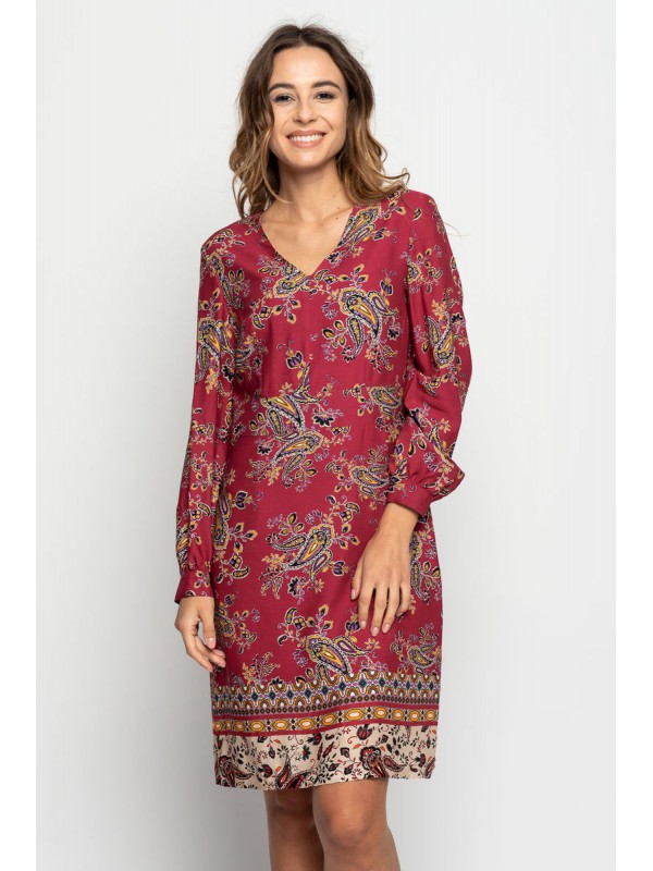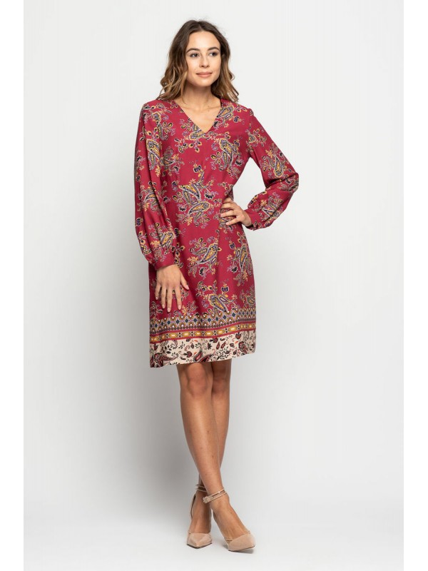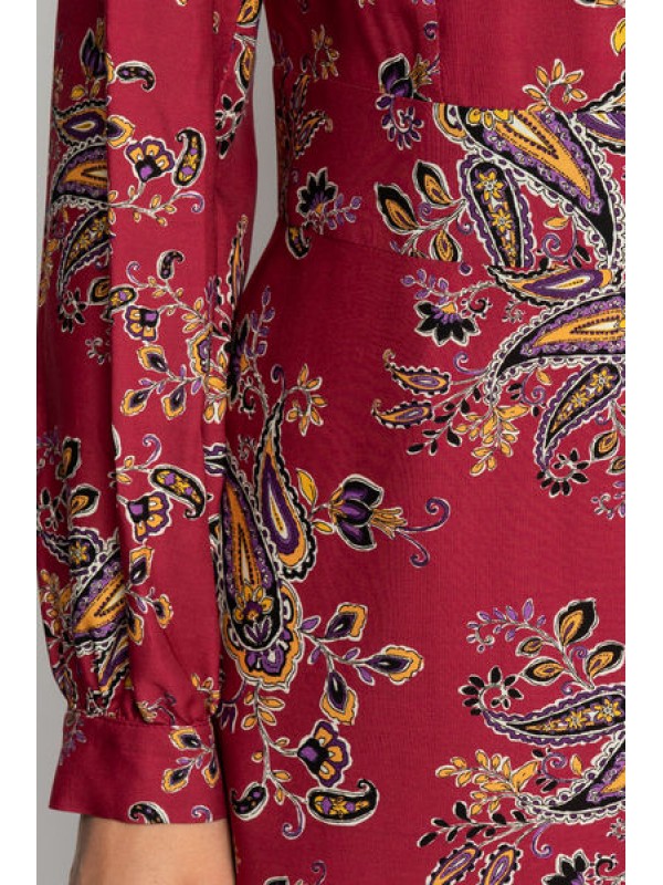 Стильное принтованное платье из вискозы в малиновом оттенке в индийском стиле.